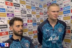 体育资讯04月20日讯 英超第33轮,曼城2-1战胜阿森纳,赛后曼城进球功臣哈兰德和即将离队的B席一起接受了天空体育的采访。